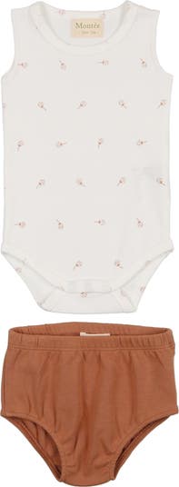 When temperatures go up, keep them cool in this sleeveless bodysuit and bloomers set cut from a lightweight cotton blend.