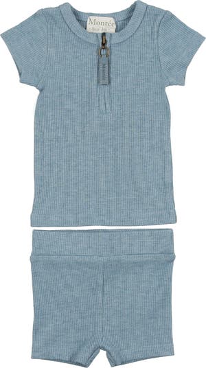 A contemporary quarter zipper accents a stretchy ribbed-cotton-knit T-shirt that's paired with comfy matching shorts.