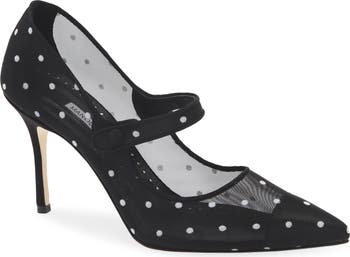 Polka dot mesh brings playful peekaboo style to a strappy pointy-toe pump set on a slender stiletto heel.