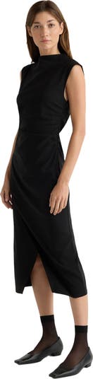 - Asymmetric neckline, ruched sides, wrap-front silhouette, sleeveless/cap sleeve style, midi length - 73% rayon, 23% nylon, 4% spandex - Machine wash cold, lay flat to dry.