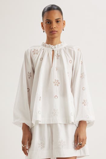 Rendered in embroidered eyelet cotton, the Manon Top has voluminous sleeves and a relaxed silhouette. A romantic piece that pairs effortlessly with denim or skirts.