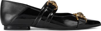 Pavé crystals and signature eagle's-head hardware glam up this smooth leather mary jane grounded by a lightly cushioned footbed and flat, walkable sole.