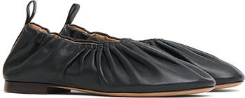 Dimensional ruching radiates from around the elasticized topline of this lambskin-leather ballet flat, updating the essential style with modern texture.