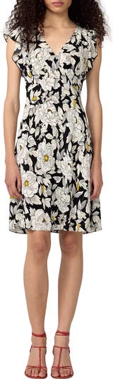 A dark backdrop showcases the lively blooms tumbled across a desk-to-dinner dress fixed with flouncy sleeves.