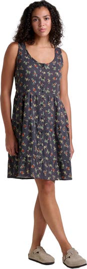 - Swing silhouette, scoop neck, bra-friendly straps, tiered skirt that hits above the knee