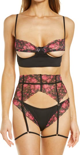 A triple threat of floral lace, open cups and slender straps makes sure this cutout bra, garter belt and thong set is sultry and seductive.