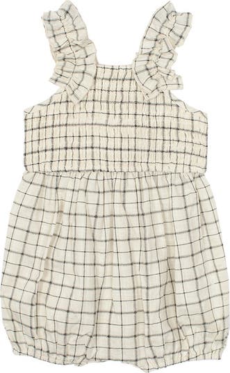 This adorable baby girls romper showcases a classic black and ivory plaid. Designed from lightweight fabric, it features sweet ruffled straps and a lined smocked bodice. Fabric Care 65% COTTON 35% VISCOSE / 100% POLYESTER Machine Wash Cold | Line Dry Do Not Bleach