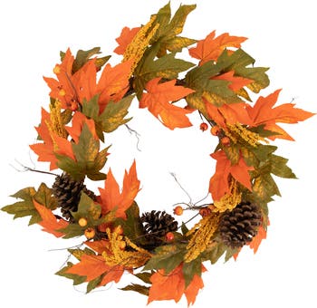 Embrace the warm beauty of autumn with this fall wreath, a stunning seasonal accent. This autumn wreath features a blend of fall foliage in green, orange, and golden tones, creating a lifelike and inviting display for your home. The arrangement is thoughtfully accented with pine cones, berries, and twigs, offering a rich texture and natural charm that mirrors the vibrant beauty of the outdoors. Ideal for displaying on your front door, wall, or mantel, this Thanksgiving wreath instantly infuses your space with the colors and textures of fall. Crafted with high-quality materials, it provides long-lasting beauty year after year—without the hassle of shedding leaves or seasonal maintenance. Whether you’re decorating for a Thanksgiving gathering, autumn party, or simply welcoming the cozy fall atmosphere, this wreath makes a striking statement piece. Its full, handcrafted design pairs beautifully with traditional fall décor styles. Bring home this green and orange fall wreath to enjoy a timeless look that enhances your home with seasonal warmth and natural elegance throughout the autumn months." Product Features: Unlit Decorated with vines, traditional and pip berries, pinecones, and maple leaves Sturdy grapevine twig backing for easy hanging - hardware not included Recommended for indoor use - if using outdoors, place under a covered area No assembly required - wreath comes in 1 piece Dimensions: 24" diameter (measured from outermost tip/edge to outermost tip/edge across the wreath) Depth: 4" Material(s): twig/foam/polyester/plastic/pinecones