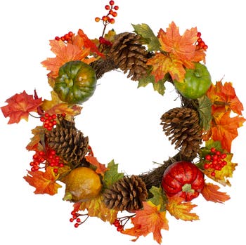 This cheerful 20-inch fall wreath is simply un-be-leaf-able! Want to add a little gourd-geous flair to your doorway? It's a fantastic, full, and vibrant piece of autumn decor that bundles all the best parts of the season into one easy-to-hang circle of fun. The unlit design features a playful assortment of classic fall elements: you'll spot colorful artificial leaves in shades of orange and green, bright speckled mini-pumpkins, a gourd, clusters of sweet little berries, and even some brown pinecones scattered throughout. This abundance of textures and colors ensures a rich, layered look that instantly makes your home feel cozy and welcoming. Mounted on a sturdy twig backing, this autumn wreath is ready to make a major style statement on any wall or door. Since it requires no assembly, you can simply unbox it and hang it up for a quick and simple seasonal transformation. It’s also a clever choice for your table! Place it flat on a dining surface with a pillar candle in the middle for an instant, eye-catching centerpiece. This lively wreath is the no-fuss solution to inject some high-spirited fall decor into your space, giving your home that fantastic, welcoming feeling all season long. Product Features: Maple leaf foliage with speckled pumpkins, gourds, and berries Bendable wire branches allow you to style the wreath any way you desire Sturdy natural grapevine twig backing for easy hanging - hanging hardware is not included No assembly required - wreath comes in 1 piece Recommended for indoor use - if using outdoors, place under a covered area Dimensions: 20" diameter (measured from outermost tip/edge to outermost tip/edge across the wreath) Material(s): twig/foam/plastic/polyester/pinecones/wire