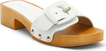 This leather-topped clog sandal set on a wooden platform delivers refined minimalism to the foot of your ensembles.