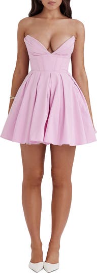 A sculpted bodice provides a perfect contrast to the voluminous, pleated skirt of this scene-stealing dress cut at a stem-baring length perfect for your next soirée.