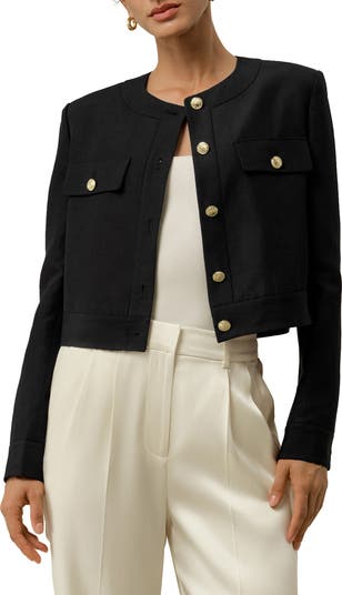 This collarless cropped jacket is crafted from a breathable silk-linen blend, offering a soft touch and natural texture. The boxy silhouette and structured shoulders create a clean, tailored look, while the shortened length enhances a refined and polished upper body proportion. Two decorative chest pockets are accented with metal buttons, adding a subtle touch of elegance. Cuffed sleeves with functional buttons allow for optional roll-up styling, bringing versatility to this chic outer layer.