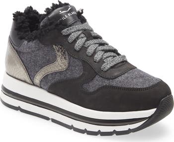 Stay in step with the season in this mixed-media sneaker with metallic accents and genuine shearling lining.
