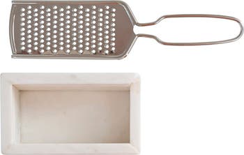 Stainless steel cheese grater with white marble rest; Add a touch of style to any kitchen with this striking grater; Made from marble and stainless steel; Grater measures 9" L x 3" W x 2" H