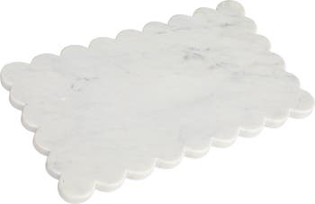- An exquisite marble cheese board boasting a scalloped edge and a pristine white finish that exudes sophistication