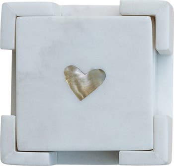 Marble Coasters with Heart Shaped Mother of Pearl Inlay, White and Natural