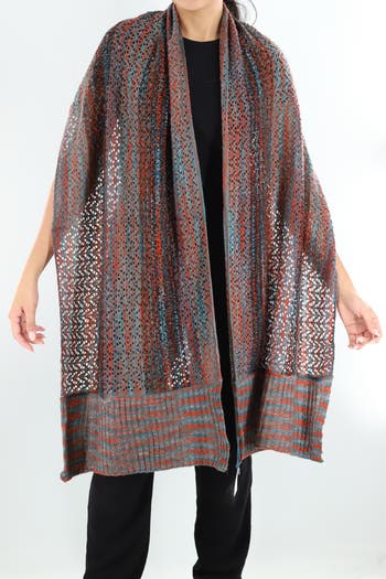 The scarf incorporates a mix of warm and cool tones, including shades of red, coral, and light blue. The colors are interwoven in a variegated or space-dyed pattern, giving the scarf a vibrant and dynamic look.