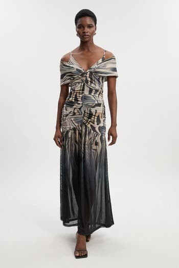 This captivating Karen Millen maxi dress showcases artistry in design with its distinctive marble print and expert craftsmanship. The plunge neckline and off-shoulder styling create a sophisticated yet alluring look, whilst the ruched detailing across the bodice sculpts and flatters your figure. The flowing silhouette with its subtle side slit ensures graceful movement as you navigate any sophisticated soirée. This versatile piece transitions effortlessly from daytime celebrations to evening ga
