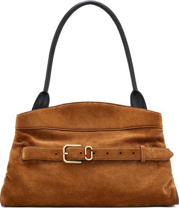 A belted strap with high-polish buckles cinches the slouchy silhouette of this spacious satchel designed with a neatly divided interior for easy organization.