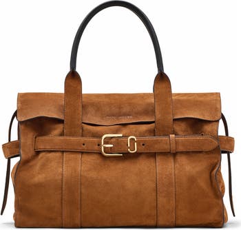 A belted topline with high-polish buckles cinches the silhouette of this spacious tote subtly detailed with the label's iconic logo debossed along the flap.