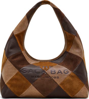 Mixed-media leather patches are pieced together to create a diamond-quilted design on a slouchy shoulder bag complete with a spacious interior and removable zip pouch for easy organization.