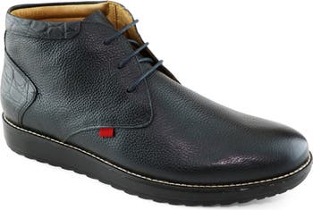 A low-profile leather chukka boot is cushioned with a densely padded footbed and a gel heel insert for superior comfort and flexibility under each step.
