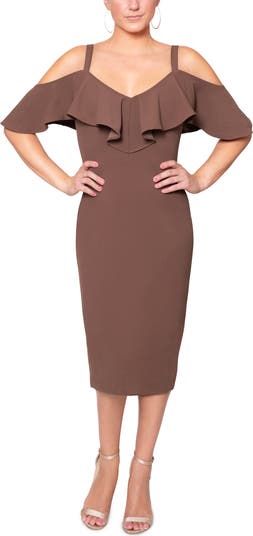 Turn heads in this elegant cold-shoulder midi dress, featuring a striking ruffled neckline that adds a touch of femininity and flair. The body-hugging silhouette flatters your curves while the shoulder cutouts and slim straps provide a modern, sophisticated edge.