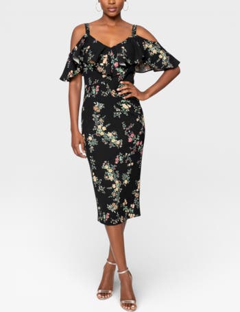 Turn heads in this elegant cold-shoulder midi dress, featuring a striking ruffled neckline that adds a touch of femininity and flair. The body-hugging silhouette flatters your curves while the shoulder cutouts and slim straps provide a modern, sophisticated edge.