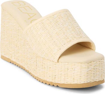 An intricately woven upper adds a beach-ready aesthetic to a cushioned slide sandal lofted by a soaring platform and integrated wedge heel.