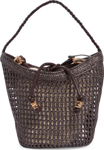Openwork detailing brings airy charm to this small bucket bag that can be worn as a crossbody with the optional faux-leather strap.