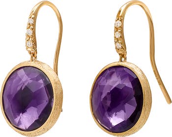 Inset amethyst and sparkling white diamonds bring elevated shine to these drop earrings rendered from 18-karat gold.