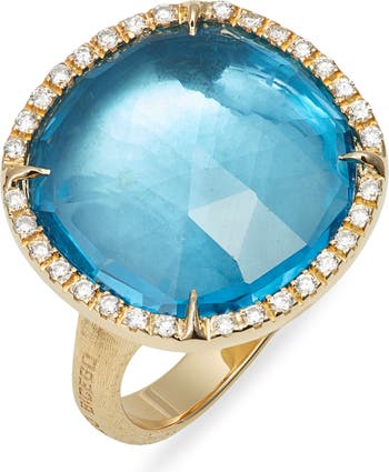 A faceted blue topaz is haloed by sparkling pavé diamonds in an ornately textured cocktail ring crafted in Italy from 18-karat gold.