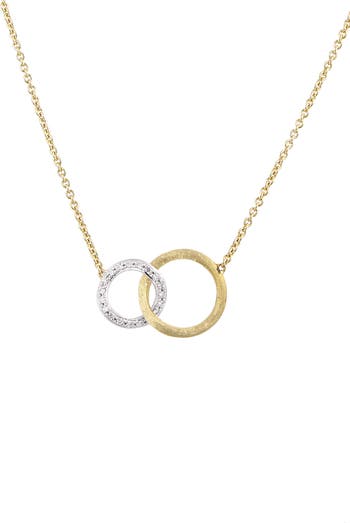 A pair of rings featuring brushed and diamond-detailed finishes interlock at the center of this 18-karat-gold pendant necklace.
