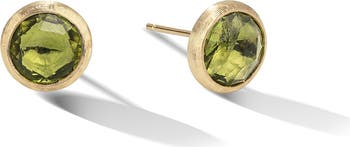 Hand-engraved settings give texture to 18-karat-gold studs glinting with faceted peridots.
