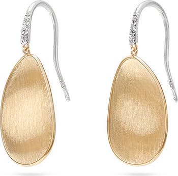 Italian artisans etched these solid-gold earrings by hand, creating a satiny shine enhanced significantly by the pavé-diamond crowning touch.