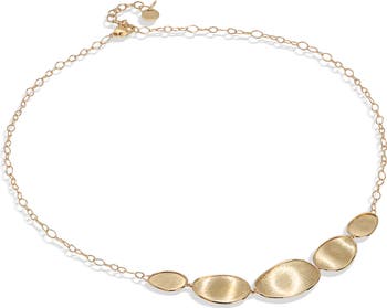 Handmade engravings add a glimmering quality to the solid-gold stations centering a chain-link necklace.