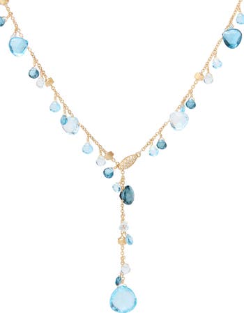 Faceted topaz are sprinkled like drops of dew across a necklace inspired by organic forms and lit up with diamonds. Hand-engraved detailing furthers the dimension with ancient Florentine techniques.