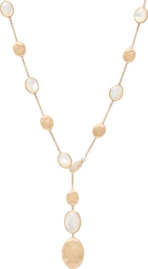 Inspired by cobblestone streets, this 18-karat gold Y-necklace features pebble-shaped stations, glowing mother-of-pearl and diamond pavé.