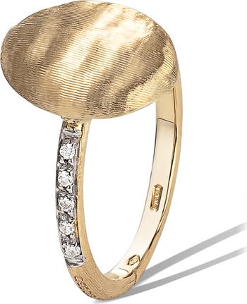 Inspired by the cobblestone streets of Seville, this stunning ring in gleaming 18-karat gold features a hand-engraved setting framed by diamonds on the band.