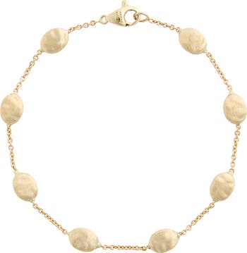 Flattened discs are hand-engraved by Italian artisans and placed on a delicate chain in a lovely bracelet.