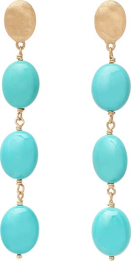 A hand-engraved bead inspired by the cobblestone streets of Seville anchors a trio of turquoise beads on these swingy drop earrings .
