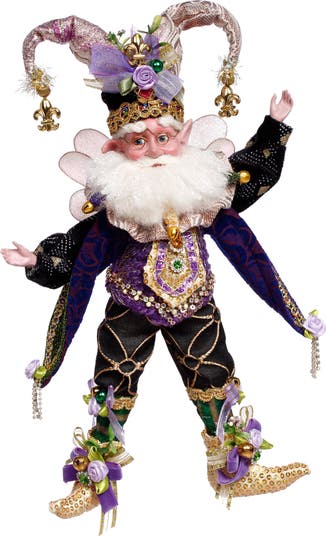 The Mardi Gras Magic Fairy (Small - 11 Inches) is a charming collectible figure dressed in opulent Mardi Gras colors of purple, gold, and green. Adorned with sparkling jewels, velvet fabrics, and intricate trim, this whimsical fairy captures the festive spirit of New Orleans celebrations. With his playful jester hat, detailed embellishments, and expressive face, he brings a touch of magic and elegance to any holiday display.