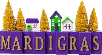 This 14"L Mardi Gras Wooden Table Decor uses purple blocks to spell "MARDI GRAS" in gold letters, topped with tiny colorful houses and golden brush trees, creating a festive Mardi Gras - themed display for tabletops.