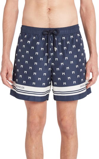 Monogram Ms march across boldly striped swim trunks designed with plenty of pockets and a drawstring waist in a nautical palette.