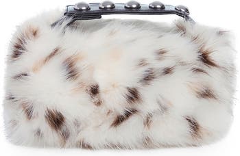 A stud-punctuated handle adds easy functionality to a fluffy faux-fur pouch splashed with leopard spots.