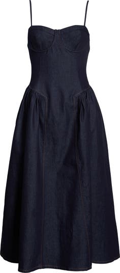Corset styling adds a sultry touch to a dark-rinsed denim dress that elevates the beloved staple.