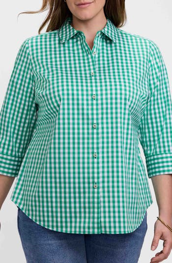 A colorful gingham print enlivens this stretchy button-up framed with three-quarter-length sleeves for a cool twist.