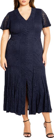 Intricate lace romances this figure-skimming maxi framed by fluttering semisheer sleeves and finished with a perfectly flared skirt.
