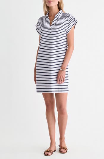Classic stripes bring nautical charm to this cotton-blend polo-dress framed by a johnny collar and short dolman sleeves.