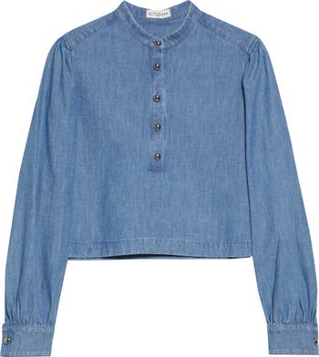 A modern take on the classic chambray shirt, this pullover version is crafted in Italy with gently gathered sleeves and metallic dome buttons.